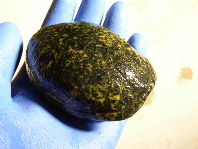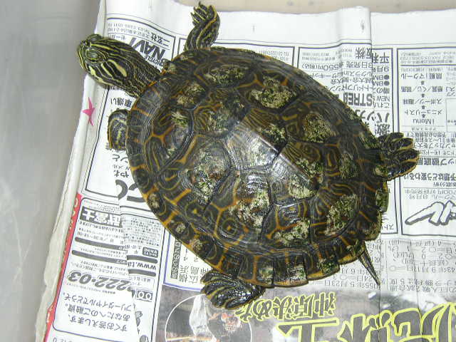 チズガメやテラピンに多いが、こいつも甲羅がだいぶガサついて見苦しかった。それと直接関係あるかどうかは不明だが、冬眠明けの03年春先に餌を食べなくなった。愛好家の助言で、背甲全体にテラマイシンを塗りたくって数日間管理したところ(左の写真)、普通に餌を食べるようになった。その後は順調に見えたのだが・・・