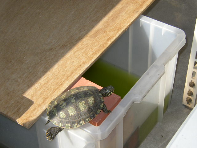 2004年2月撮影。イシガメやクサガメの感覚で、冬眠中は下手に上陸すると衰弱してしまうというイメージがあったので、私は上陸出来ないように木材を組んで、陸場を強制的に封鎖していた。ある日、ベランダを見たら、レンガとその上の木材(こいつの前肢がやっと届くくらいの高さ)を乗り越え、衣装ケースの上にまで乗り上げて日光浴しているこいつの姿が!今にして思えば、こいつはそこまでして日光浴したかった訳で、この時点で自分のやり方を見つめ直すべきだった。アメリカヌマガメの類は、冬場でも多少の日光浴を必要とする傾向がある。真冬に潜る場所もなしに上陸しっ放しは流石に不味いが、様子を見ながら、彼らの自主性に任せておく方が失敗は少ないと思う。