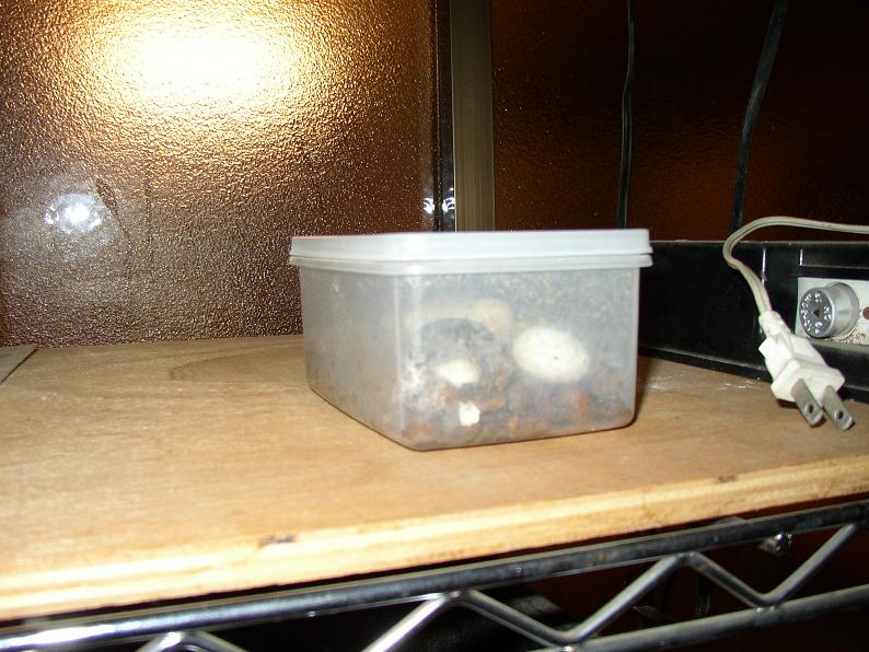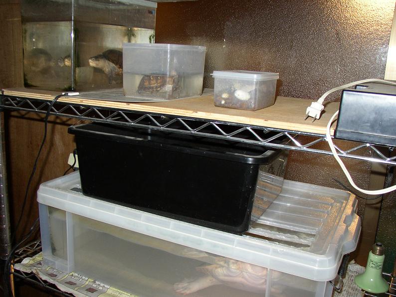 親個体はかなり狭いケース(35×20cm程)で飼育。電気の類は一切設置しておらず、良くこれで繁殖まで持って行けたな・・・と我ながら思う(ミシシッピドロガメなんかは基本的に上陸しないが、本種は良く上陸するので、本来はレフ電球の1つでも設置してやるのが良いと思う)。室内で通年無加温飼育。ラックの2段目に設置しており、下段に置くよりは多少暖かいと思う。
