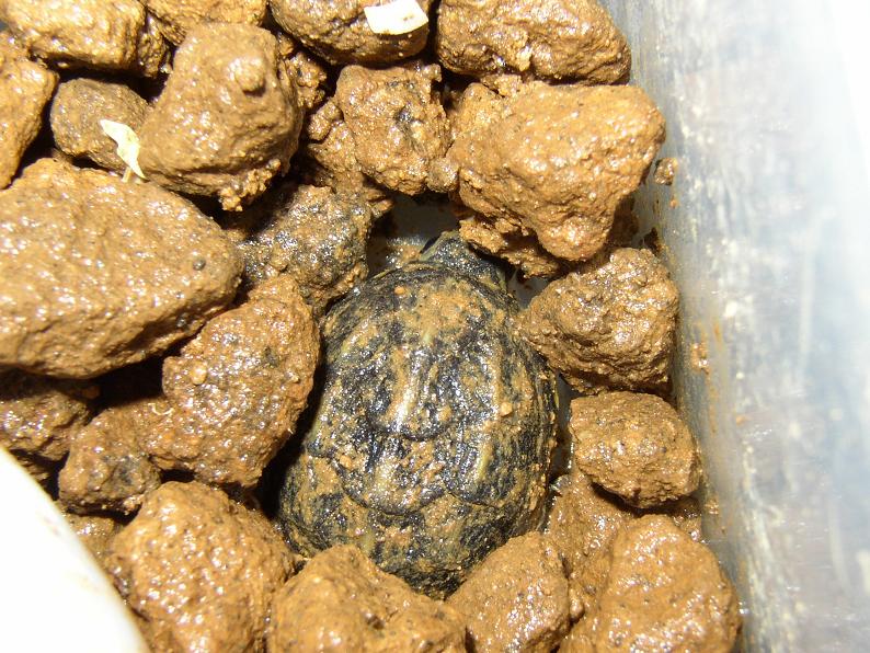 今年6月中旬、ミスジドロガメが水中に産み落とした卵を回収し、とりあえず駄目元で管理してた(産卵床を設置していないので、例年発見する前に親個体に破壊される事が多かった)。そこら辺にあった園芸用の赤玉土を流用し、土が乾いてきたら適当に湿らす。何せ飼主に繁殖経験がない為、白濁も発生も順調かどうか判らない。諦め半分(というか9割方諦めモード)で、常温任せで放置し続けていた。湿らせるのを忘れて、だいぶ乾燥してしまった事もあったような。