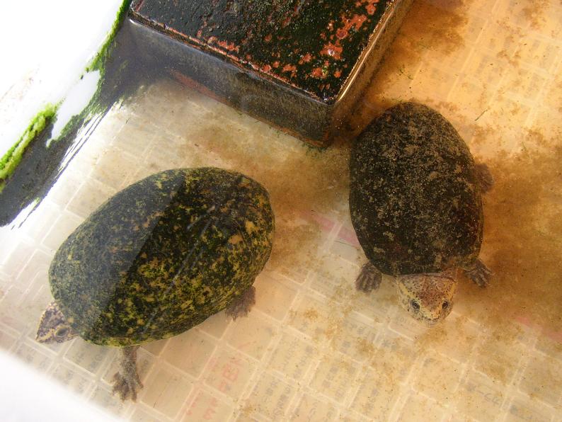 こちらは別水槽で飼育中のペア。2006年4月より飼育。こちらのメスは未だ産卵すらしていない。窓際に設置している為、冬に寒過ぎるのかもしれない。オスはかなり荒い個体で、これまでにメスを2匹殺している。以前こいつに指を噛まれたが、思いのほか痛かった。手に持つ時はフロリダドロガメ並に気を遣う。ちなみに、このオスも派手に甲羅が欠けている。我が家には何故か甲欠けの、しかしながらやる気はあるオスが巡って来る。