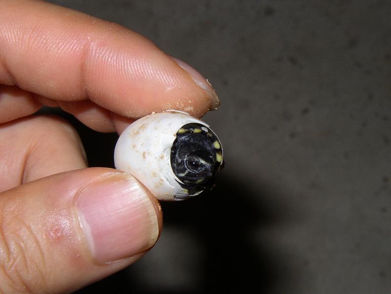 前回の記事の時点で、殻から頭だけ出していた最後の1匹。飼主の方が堪え切れず、2日後に強引に(と言ってもそ~っとだが)殻を剥いてみたところ、まだピンク色の卵黄が付いていた・・・(滝汗)。焦ったものの、数日後には吸収された。下の画像は剥く前。