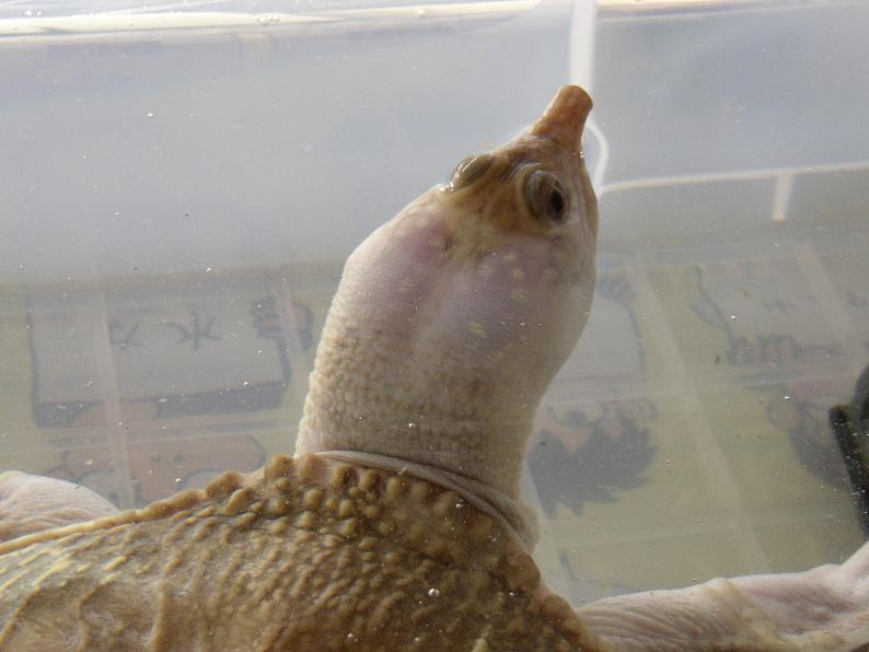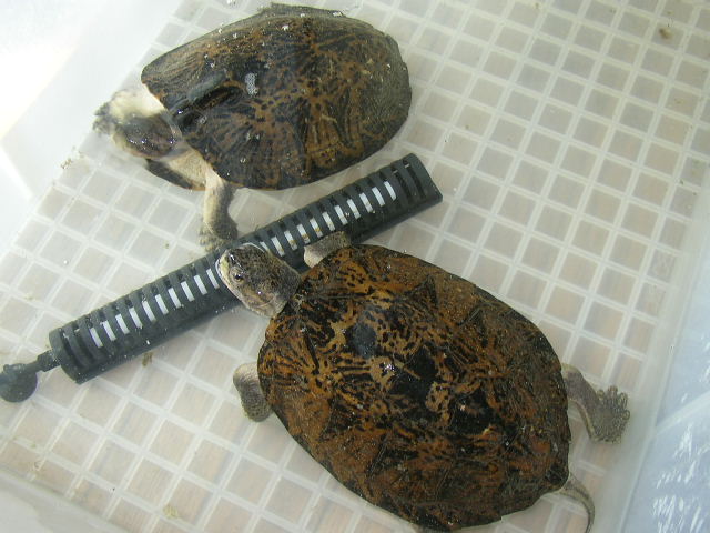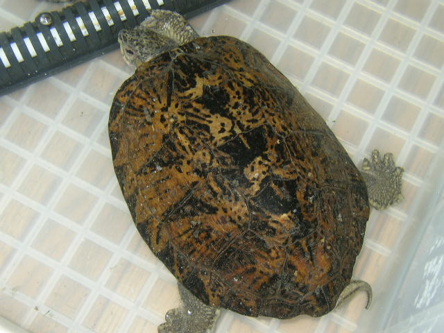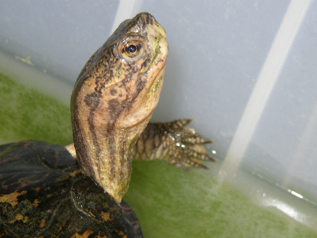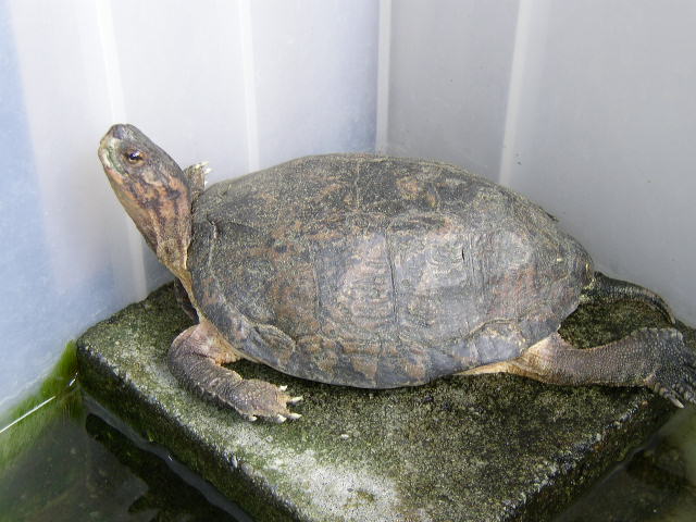 昔の画像を見てると、また飼いたくなってしまう。本種は、マルガメ属の中ではズバ抜けて美しい。この色彩は筆舌に尽くし難い。飼育に関しては、基本的には丈夫。マルガメ全般に言えるけど、新しい水だと今一つ調子が上がらない印象。落ち着いた水で、少数飼育がいい。注意点としては、マルガメの仲間は手で持ち上げると糞尿を撒き散らす(尿だけの場合もある)。意外と話題に上らないけど、自分もこれまで何度やられた事か・・・。特にお腹側を見る時には注意されたい。人慣れしたアダルト個体を除けば、普通にやるものだと思ってた方がいい。
