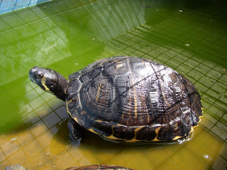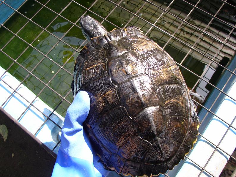 手に取って見せて貰う。何度見ても、明らかに尾が細い。100%断言はできないものの、99%メスっぽい。それまでオスばかり飽きるほど見て来たんで、違いは一目瞭然だった。震えた。買った。遂に念願のキバラメスを手に入れた。こんなに遠回りしないで買えた人も中にはいるんだろうけど、自分の場合は本当に苦労した。ヒグチで初めて見てから実に6年。自分ほどキバラガメのメスを欲しがった人も、そしてその入手に苦労した人も、そうはいないと思う。捨てられて野生化すらしている昨今では、共感して貰うのはちょっと難しいかな。