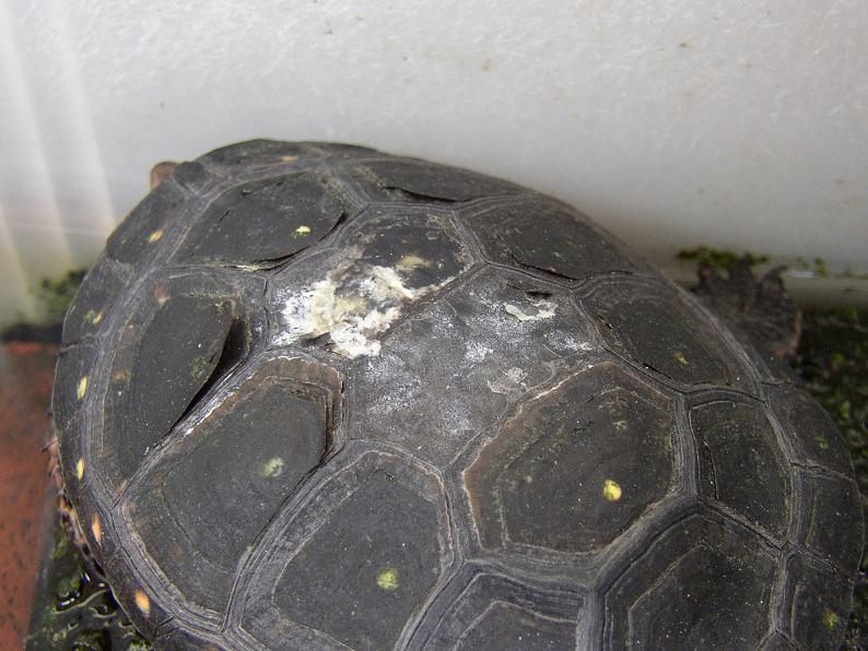 ハコガメにありがちなこのガサつき、我が家ではどうしても防げずにいる。甲の表面の荒れた部分から何らかの菌に感染するのか?まずは甲の表面を擦らないのが第一だと思うが、極力擦らないようにしていても結局こんな風になってしまった。同じブラシを使い回したり、同じ飼い方をしていても、症状には個体差がある。全然平気な個体もいれば、甲羅全体がどんどん白くなってしまう個体もいる。