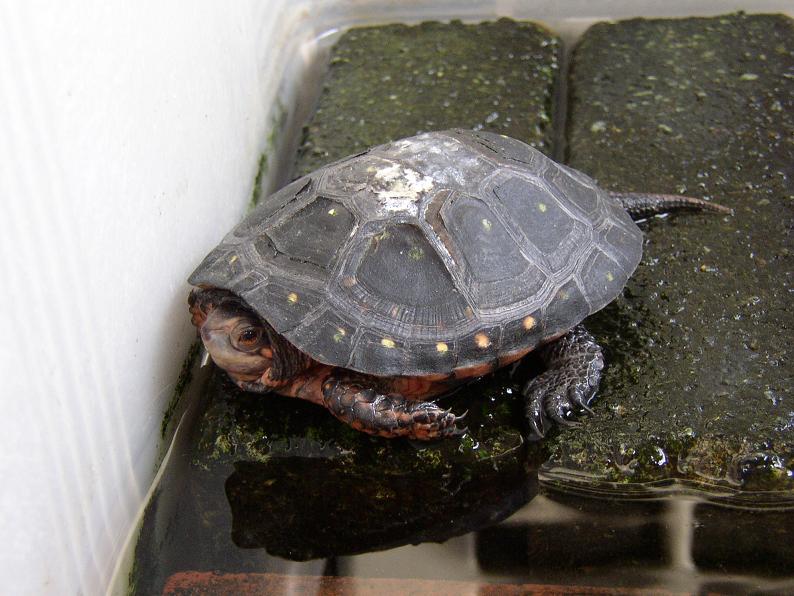 嗚呼・・・。orz 常に土にまみれていて、甲羅のあちこちがこんなになるまで気付かなかった。土で飼うのは野生に近付ける一方で、細部まで観察し辛いという最大のデメリットが付きまとう。土を落とそうとして、下手に擦ると余計に酷い事になりそうだし・・・。成長も遅いし、隠れる場所をなくしてオープンにして、活発化させる道を選んだ。