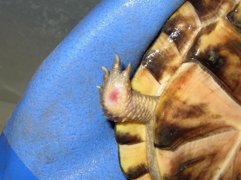 全く気付かなかった。一昨日までは普通に餌も食べてたし。個別管理しているので、他の個体に噛まれるなんて事は有り得ない。カメに危害を加えるような動物を餌にあげたりもしていない。という事は何らかの感染症?水換えはほぼ毎日している(サボっても2日まで)んだけど・・・。