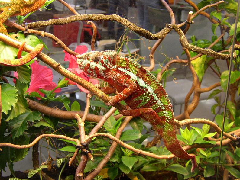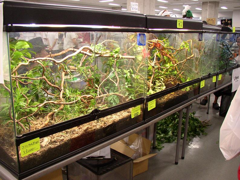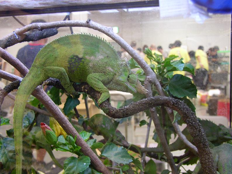 やはり爬虫類はおまけという感じだけど、それでも頑張って出展してるブースもちらほら。来場者の目を引いていたカメレオンのレイアウト。パンサーカメレオン(アンビローブ)。カメレオンに疎い自分でもこれは判る、フィッシャーカメレオン。