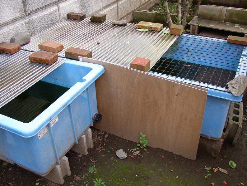 庭に置いた工業用容器(写真手前)で飼育。寒さにはかなり強く、1年目から難なく冬を越した。ただ、それで慢心してしまったように思う。2度目の冬眠後にメスが1匹死亡。残った2匹をしっかり管理したい。