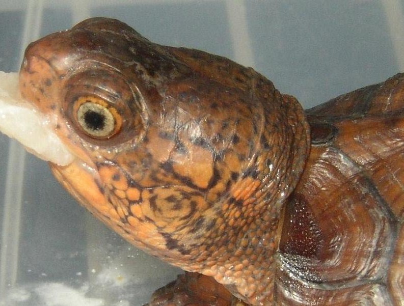 流石に丈夫な種で、すくすくと成長し、見ていて楽しかった。甲羅の模様が消えて黒くなっちゃったのはガッカリしたけど。最初の冬は加温飼育し、その後はベランダで通年無加温飼育。ずっと元気にしてたけど、8年後の春、冬眠明けに体調を崩して死んでしまった。8年に渡って餌は配合飼料と乾燥エビが主体で、植物質の餌は全くと言っていいほど与えてなかった。今思うと、そんな食生活が長年続いて、個体の健康を阻害してたのかもしれない(死亡との直接の因果関係は不明だけど)。サイズが約13cmから伸び悩んでたのも、その辺りに一因があった?
