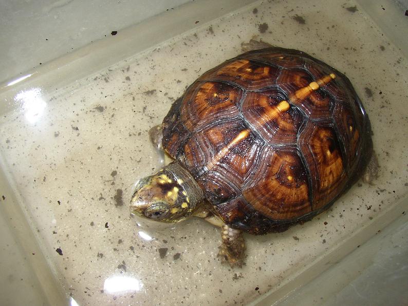 日光浴させた時にふと腹甲を見たら、御覧の通り。ショック。何時の間にこんな状態に?最近、少し観察を怠ってたかもしれない。濡れてると判り辛い事もあって、こんなになるまで気付けなかった。日光浴させても、4号は腹を床に付けておとなしくしてる事が多いので、そこだけ湿度が残って、しっかり乾燥してなかったのかも。何たる不覚・・・。