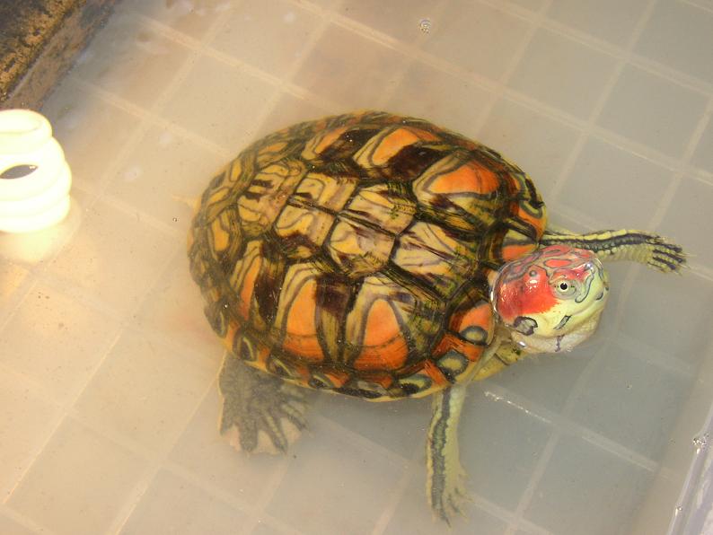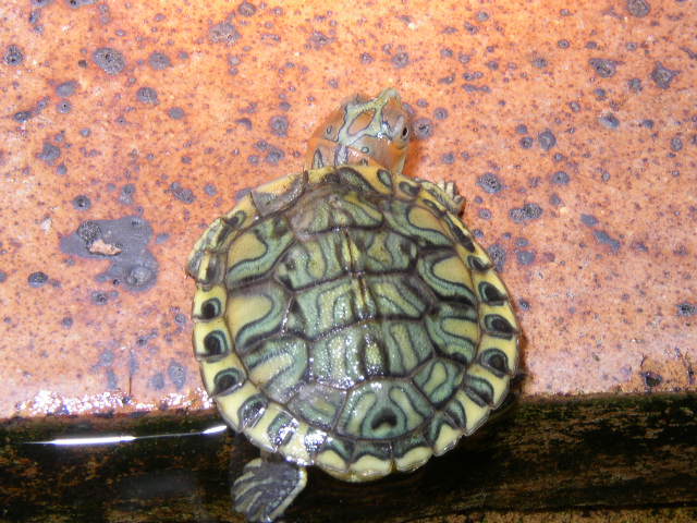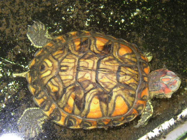 ↑09年10月。ふと気付いた。これまで1回も脱皮させてないじゃん!大きくなる訳がない。何となく飼い続ける日々の中で、客観性をすっかり失っていた。太陽光に当てれば多少解消されるかと思い、09年夏から初めてベランダに出した。室内飼育に慣れ過ぎた為か、餌を殆ど食べない。それでも太陽光の影響は絶大で、10月に初めて甲板が剥けた(剥いた)。しかし、剥いたその下の甲板も古そうに見える。数年分の古い甲板が蓄積されてるんだと思う。無理に剥がす訳にも行かないので、時間をかけて直して行きたい。