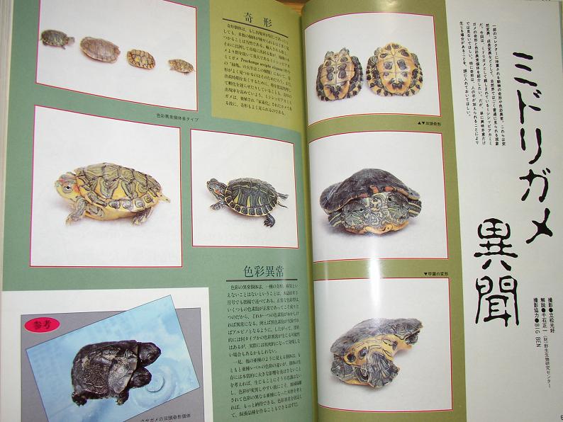 ↑カラー写真で色変ミドリガメの特集。たった2ページだけど、爬虫類専門誌もネットもなかった当時ではとても珍しい特集。たったこれだけでも心をときめかせていた。発刊から数年後、中学時代に古本屋で買ったんだけど、立ち読み中にこのページを見つけた時は小躍りしたよ。