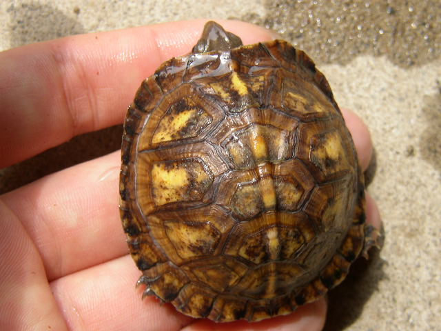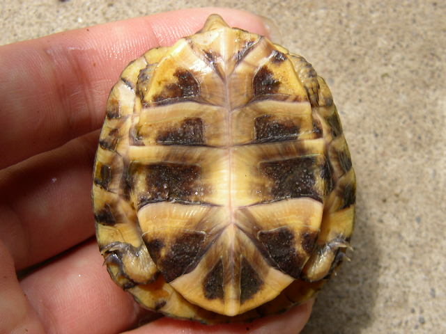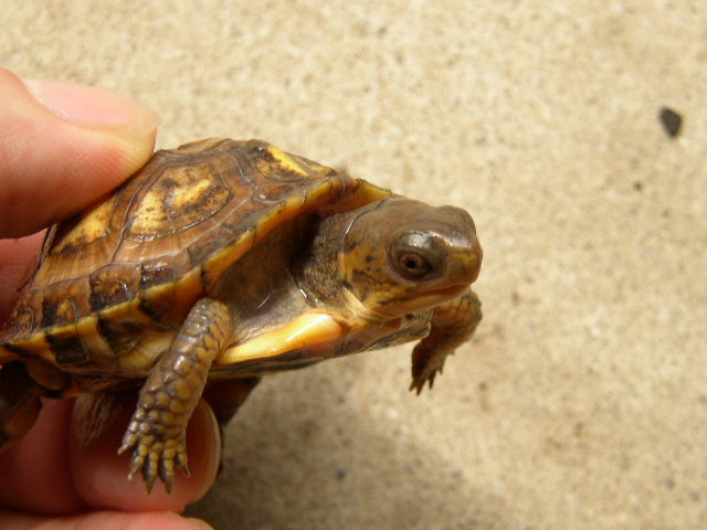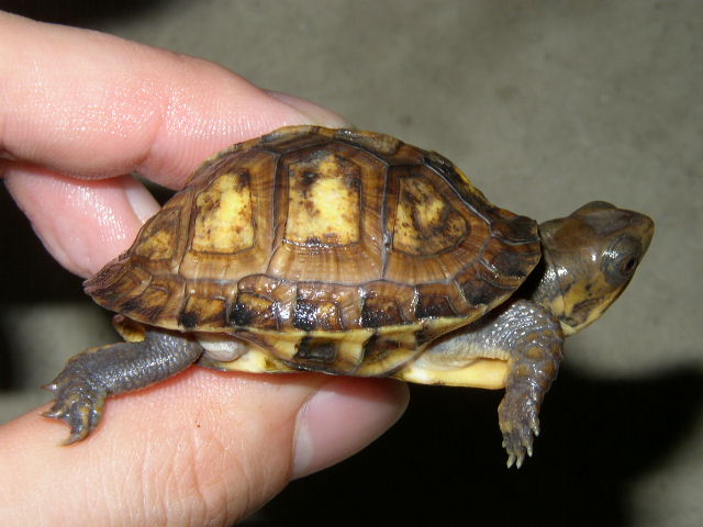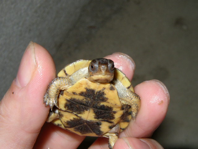 ↑昨年11月撮影。当時約3.6cm。HBM2008で、トウブ他アメハコを多数販売しているブリーダーから購入。この時は自分がまだ模様や色味について理解しておらず、とりあえず甲の厚みを優先して選んだ。でも、今こうして画像を見返してみると、前肢や喉元の色味はかなり有望だったんだな。結果オーライ。餌は配合しか与えていなかったそうだ。