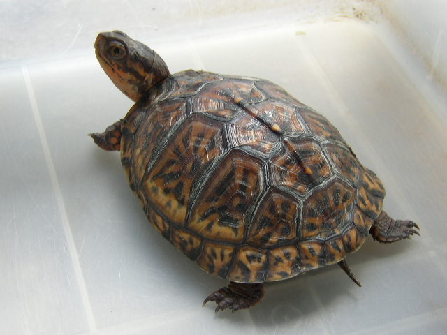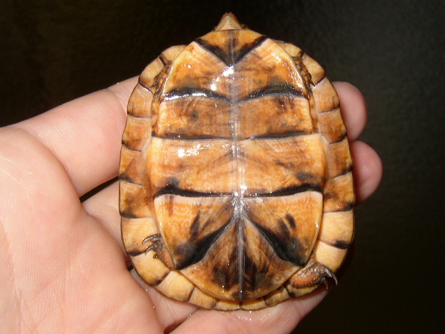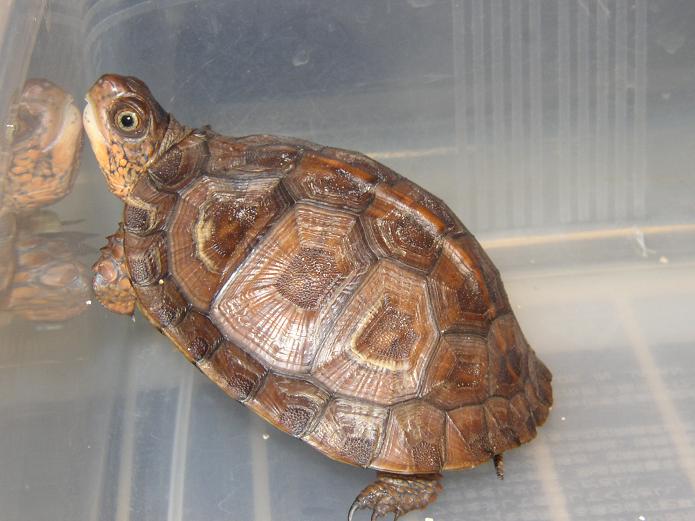 ↑今年5月撮影。5cmを越える頃からどんどん地色が明るくなった。肌の色味も、山吹色から一気にオレンジへと変化。屋外で撮影した左の画像が肉眼に近い。この頃は管理をサボりがちで、甲羅に付着したヌルヌルをもっとこまめに落としてやれば良かった。また、実は購入してから今年9月まで太陽光に殆ど当てていない(室内でレプティサン5.0のみ)。これも後悔している。