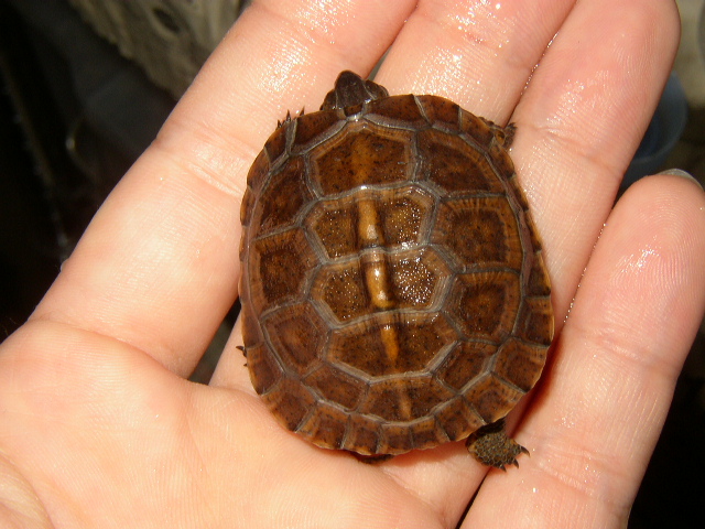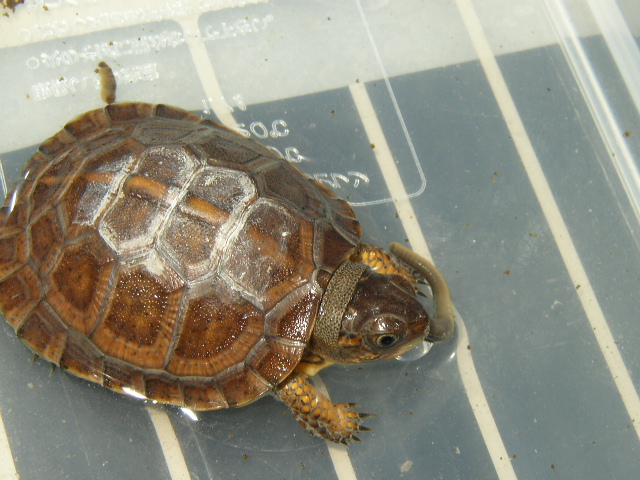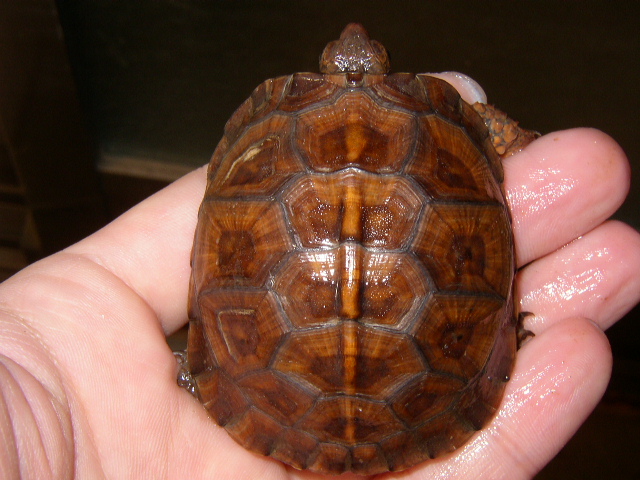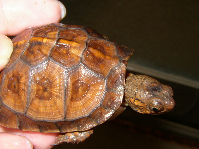 ↑近影。こちらも5.5cmを超えた。甲羅の地色がどんどん明るくなり、肌も派手になって来た。側頭部から喉元にかけての複雑な模様がとても美しい。肋甲板にうっすらと黒斑が浮かんで来たように見える。これからどう化けて行くんだろうか。2号と4号を見る限り、08CBはこの血統の中ではむしろ例外的な色彩パターンだったのかもしれない。08CBは色味こそ派手だが、2号と4号のような複雑な模様はない。