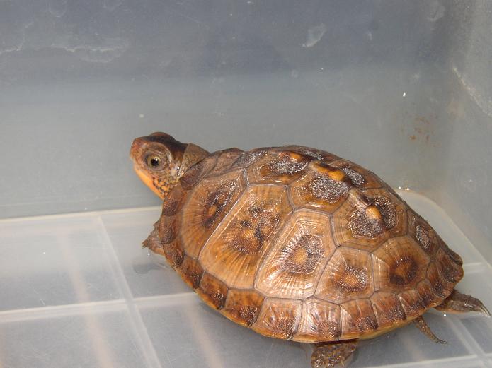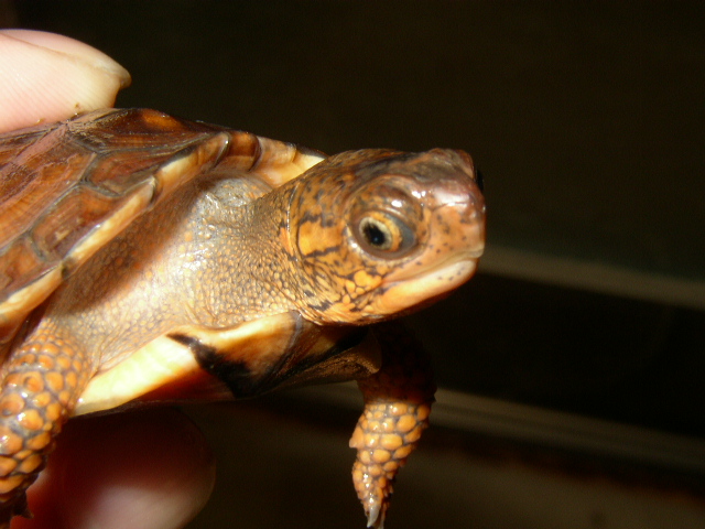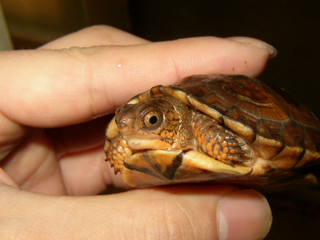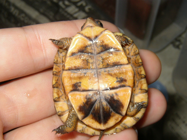 ↑08年12月撮影。購入間もない頃で、4.5cmくらい。前肢の発色が凄い。黄色というより山吹色。派手なトウブといえど、ベビーの内は地味なものとそれまで思い込んでたが、覆された。肋甲板が左右非対称なのは家に到着してから気付いた。出品画像を見返してもしっかり写ってるし・・・。けど、そんなのどうでもいいくらいの、前肢の発色。生餌しか与えてなかったそうだが、うちに来てからすぐに配合飼料も食べ、選り好みしない優等生だった。