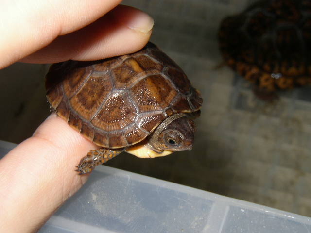 ↑10月初めに撮影。約4cm。このサイズにして地色はかなり明るく、甲板の黄斑もいい感じ。肌の色味も濃い。前肢の鱗はべっとりと隙間なく黄色く覆われ、かなり将来有望な予感。今日まで特に名前は付けてないけど、とりあえず昨日紹介した黒い方を2号、こいつを4号と呼ぶ事にした(出品当時、黒い方がNo.2、こいつがNo.4だったので)。