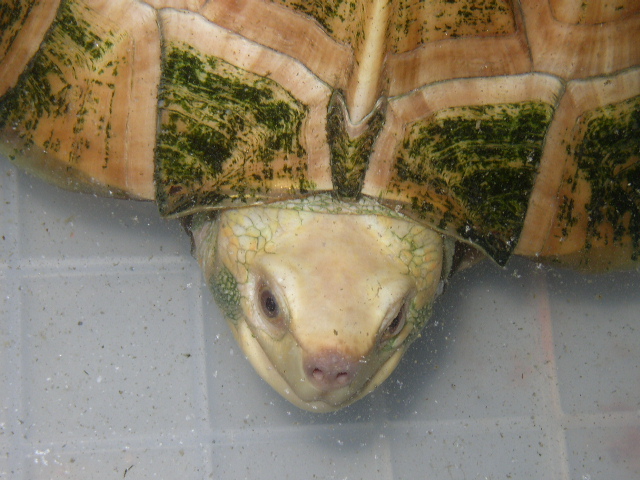 亜種も判らずに購入してしまった訳だが、綺麗な個体。何とも言えないクリーム色の体に、ほんのり染まる頭部のオレンジ色。また、黒目とのギャップがいい。某ショップのサイトで画像を見た時、こんなに美しいカメがいるのか!と衝撃を受け、即座に都内まで赴いて購入して来た。一時、飼い主の怠惰でかなり苔むしてしまったのが悔やまれる。昨年転職してから時間が取れるようになって、我が家のカメ達の管理状況もだいぶ改善されたが、まだ当時の名残が酷い。苔で台無しだけど、本来はとても綺麗な個体だ。