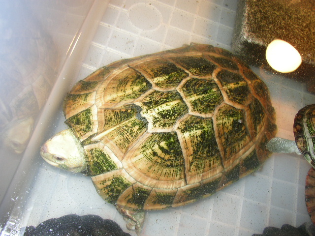 ハコヨコと雑居させるのはどうなの?と思われそうだが、一応言い訳を。こいつは購入当初かなり臆病で、大事に単独飼育してたら非常に小食で、人影にビクビクしてた。ところが、寒くなって来て加温飼育に切り替える際、一時的のつもりで雑居水槽に入れたところ、性格が大変貌した。ハコヨコを押しのけて餌を貪り、あっという間に水槽内のボスに。カメという動物は、環境の変化でたまに意外な本性が現れる。